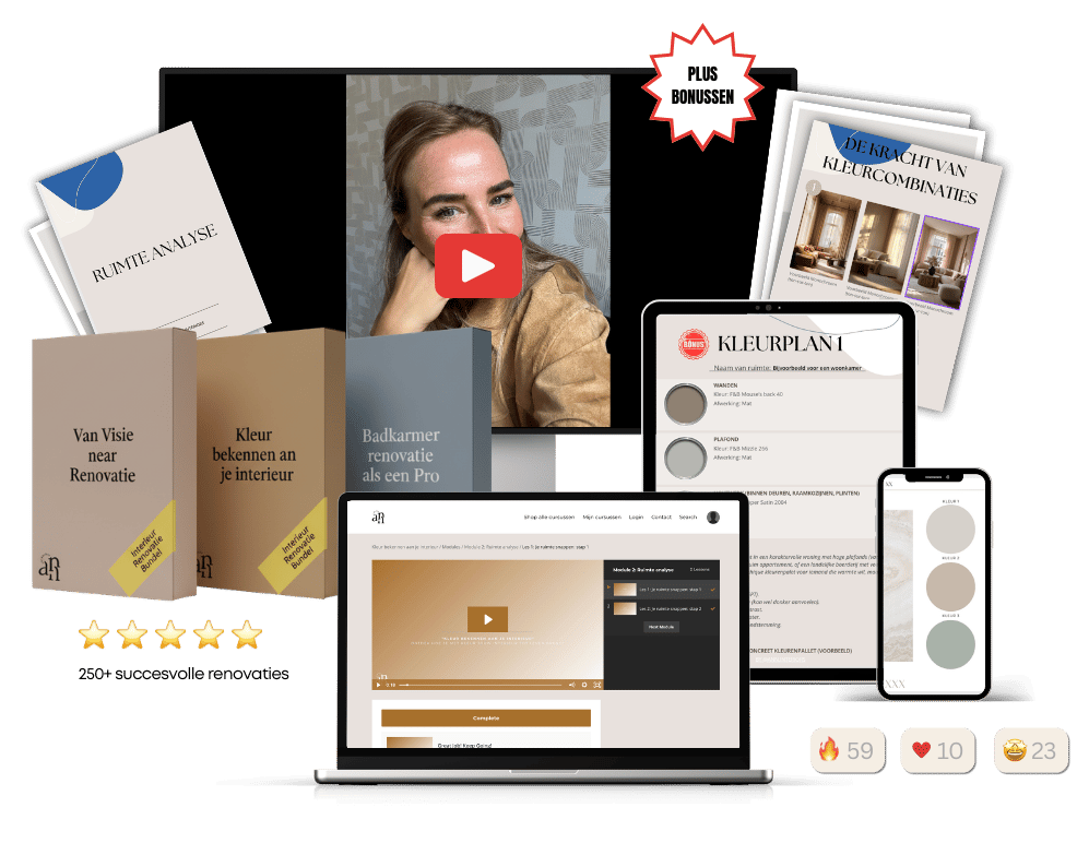 De modules zijn zo opgebouwd dat je ze in eigen tempo kunt volgen, met korte, onderbouwende video’s van ongeveer 5 tot 20 minuten. De kleur module kun je in één avond rustig doornemen en direct toepassen in je interieurplan. De renovatie- en badkamer module vragen meer uitwerkingstijd: reken op ongeveer een week om een goed doordacht plan op te zetten, afhankelijk van de grootte en complexiteit van je project. Je hoeft dit niet aaneengesloten te doen; je kunt steeds een module bekijken, direct aan je eigen plan werken en zo stap voor stap toewerken naar een compleet, uitvoerbaar plan.